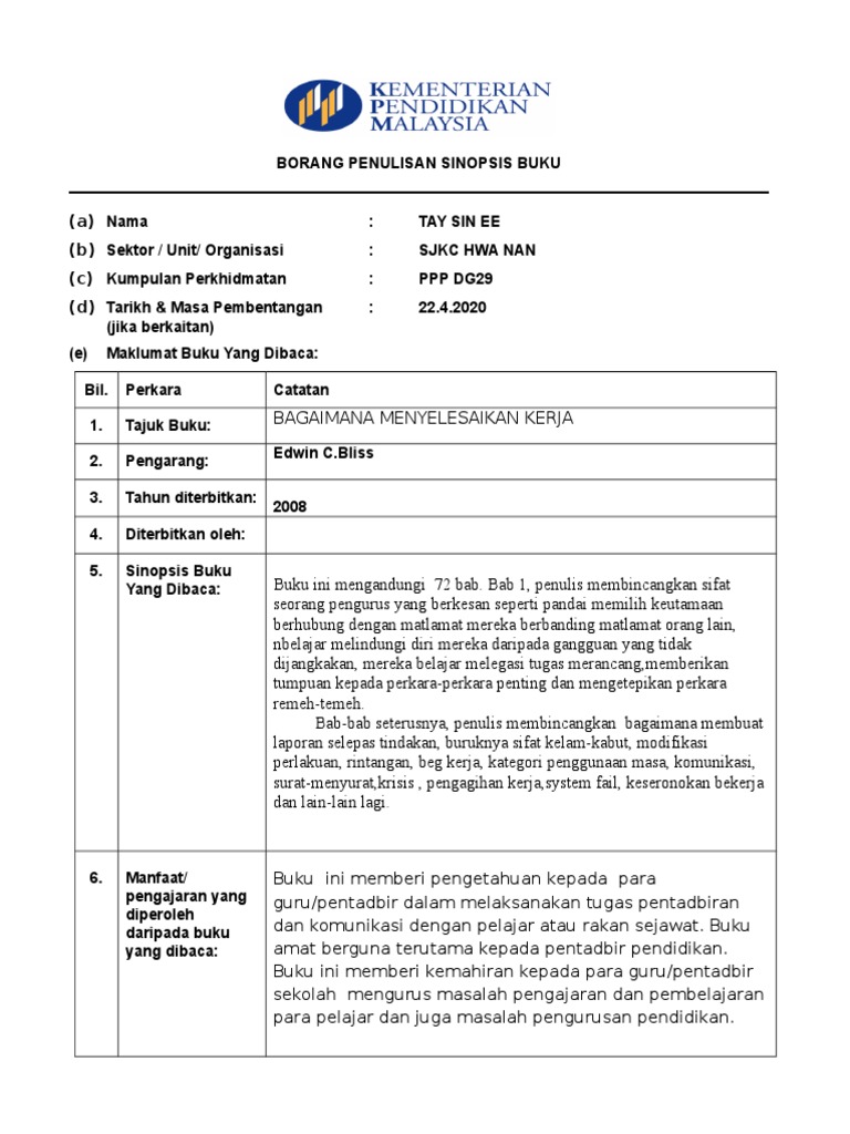 Borang Penulisan Sinopsis Buku Pk10 Pdf