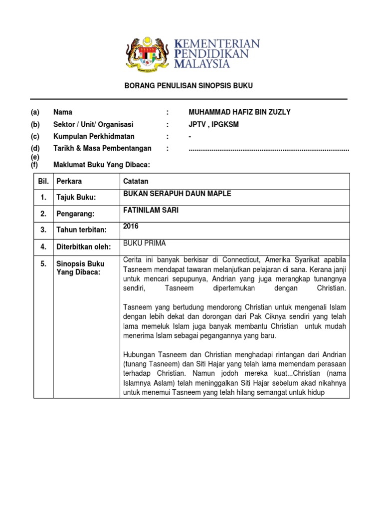 5 6077838225211129986 Doc Borang Penulisan Sinopsis Buku A Nama Siti Nur Syukriah Binti Mohd Sukri B Sektor Unit Organisasi Pendidikan Course Hero